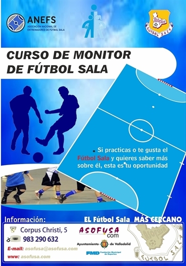 El próximo día 21 de octubre dará comienzo un nuevo curso de monitor de fútbol sala, se impartirá en la sede de Asofusa C/ Corpus Christi, 5 de lunes a viernes en horario de de 18,30 a 20,30 horas.